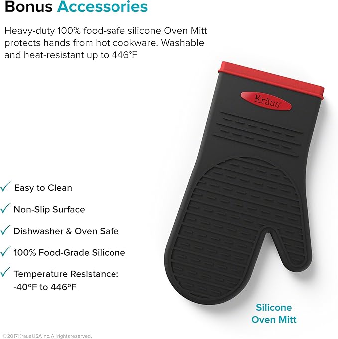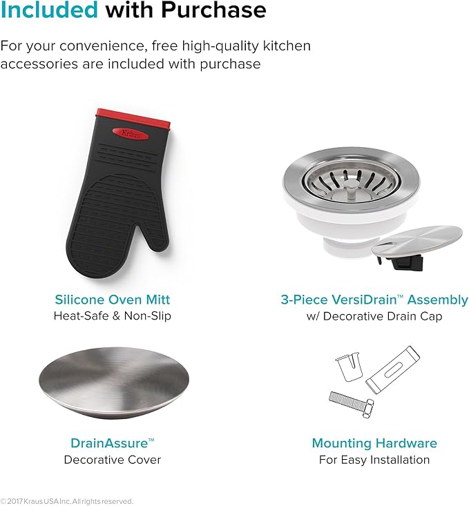 - KRAUS EXCLUSIVE DrainAssure WATERWAY: Ground-breaking waterway engineered to channel water directly into the drain, even with dishes in the sink, helping prevent standing water at the bottom of the bowl