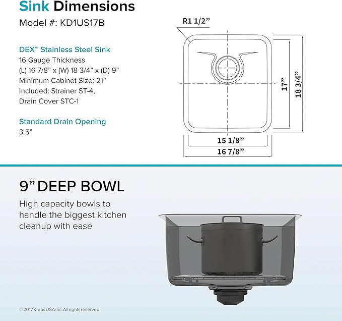 KRAUS Dex 17-Inch Undermount Single Bowl TRU16 Gauge Stainless Steel Kitchen Bar Sink with DrainAssure WaterWay and VersiDrain Assembly in Radiant Pearl Finish, KD1US17B