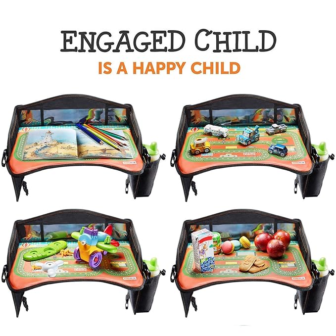 - ⭐ ENGAGING & AMUSING car play table – Keep your little one engaged in drawing, eating or playing during a road trip or a flight, offer children a firm surface in the form of an infant travel tray for car to keep the stuff.
