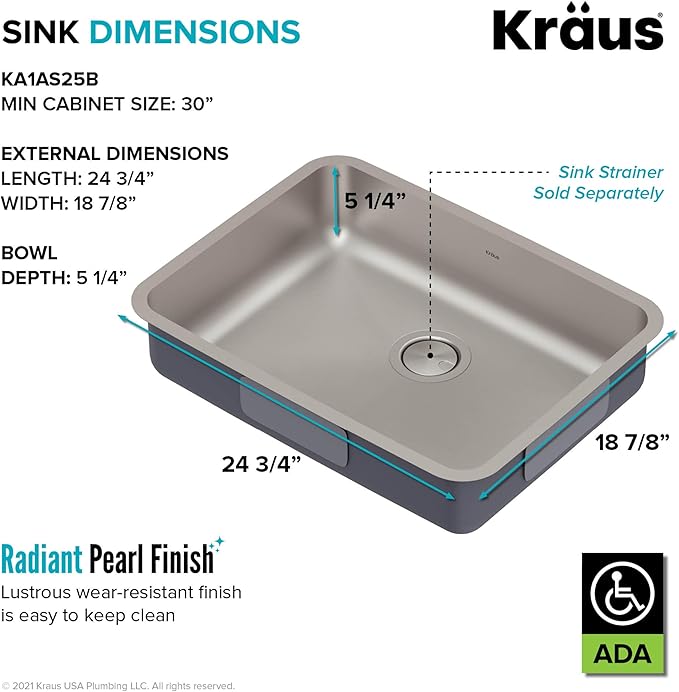 KRAUS Dex 25-inch Undermount 16 Gauge Stainless Steel Single Bowl ADA Kitchen Sink, KA1AS25B