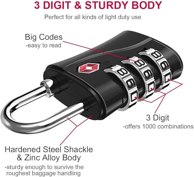 - ▶EASY TO USE: The resettable TSA locks for luggage allow you to set you own combination with 1000 unique options. Simple 5 steps and instructions are included right at back of the package cardboard. Please note that NEVER forget your password or the travel lock will be of no use.