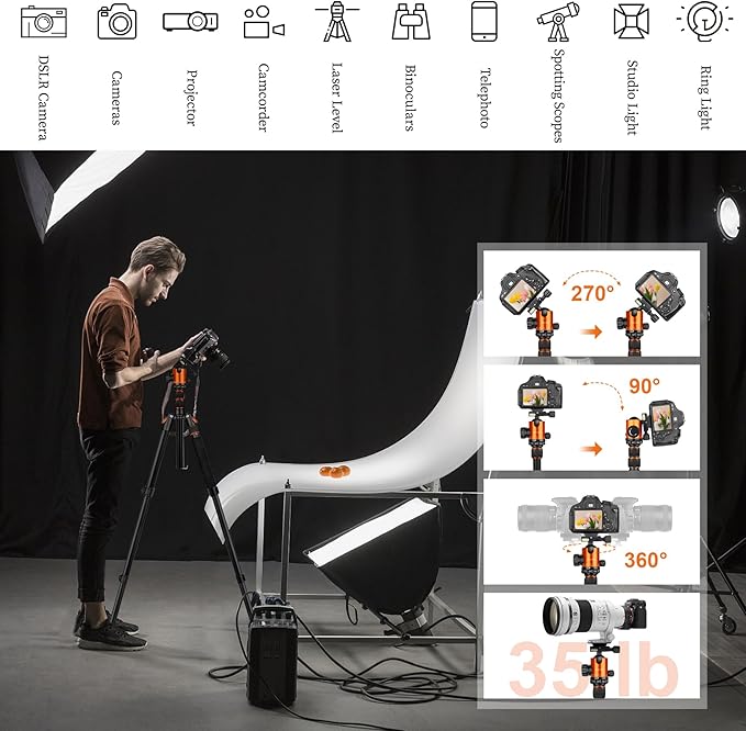 - 38 MM Panoramic Ball Head -- Tripod for Camera with 360° panning and +90°/ -70° tilt to get the perfect shot every time. 3 built-in bubble levels to accommodate landscape or portrait orientations, precise 360-degree scale realizes accurate image alignment