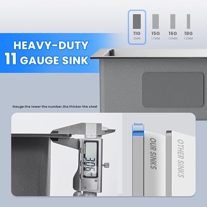 - 【Ultra-Quiet & Anti-Condensation Design】 3mm sound-absorbing undercoating and thick rubber padding are applied to significantly reduce noise from water and impacts. The anti-condensation coating helps prevent water droplets from forming on the sink's exterior