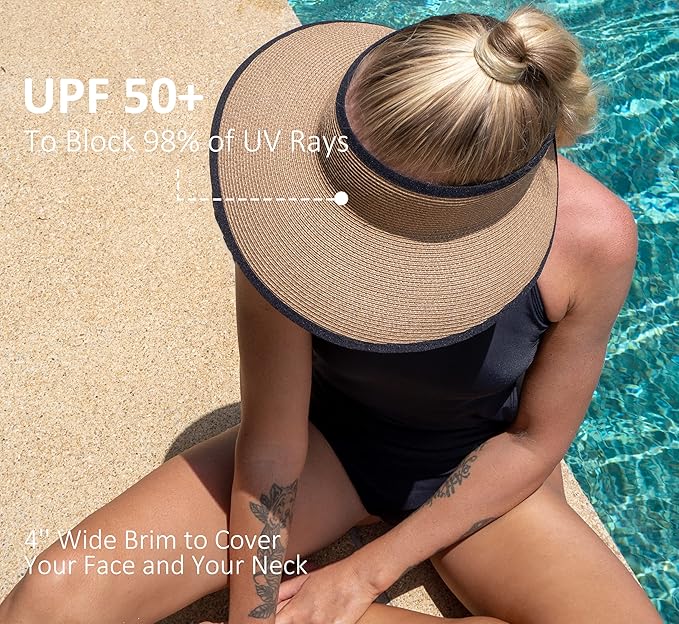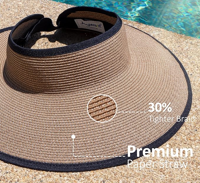 Joywant Womens Sun Visor Hats, Packable Wide Brim Ponytail Beach Hat Straw Visor Summer Beach Vacation Essentials for Womens