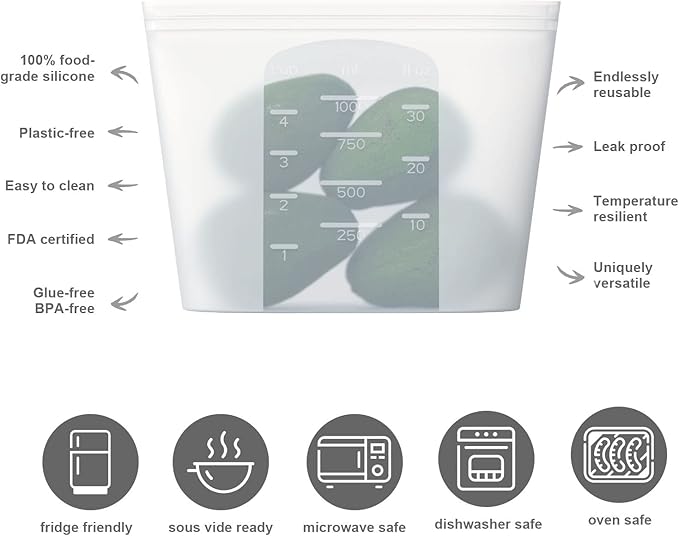 Reusable Silicone Food Storage Bag, for Microwave, Oven, Fridge, Freezer & Sous Vide Zip Sealed Containers (2 Middle size 32oz 1000ml)…