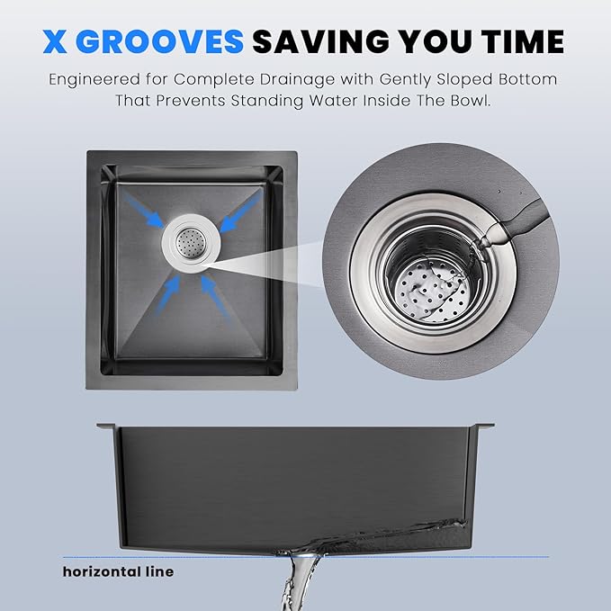 - 【Premium Material】18 GAUGE Premium T-304 grade stainless steel (18/10 chrome/nickel) will not rust or stain 37% thicker than most sinks. Unlike satin finishes, the handmade black diamond finish hides scratches and matches your kitchen appliances