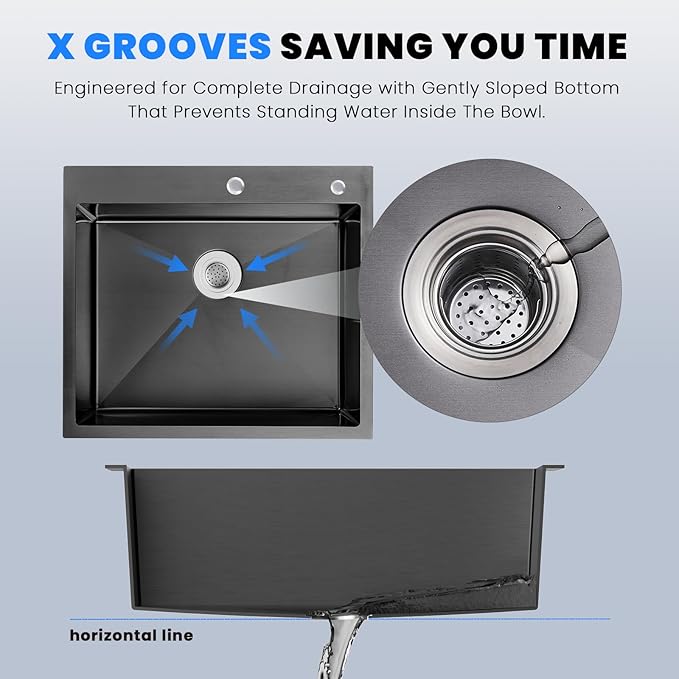 - 【 Fast Drainage】The X groove is designed for easy drainage, the a slight dip at the bottom to prevent water accumulation. while 4 drain grooves on the sloped bottom of the sink help direct water to the drain.