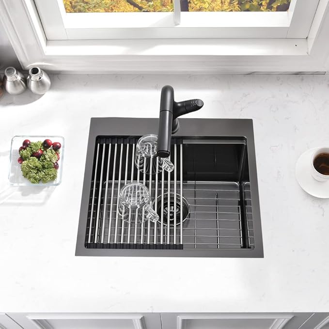 - Durable Material, NANO Features : This black drop in kitchen sink is constructed with T304 stainless steel in TRU16 real 16-gauge for superior strength and durability. Easy to clean and long-lasting. And top mount kitchen sink with Gunmetal Black NANO brushed works like water on Lotus leaf - no water trace left .Very easy to clean.