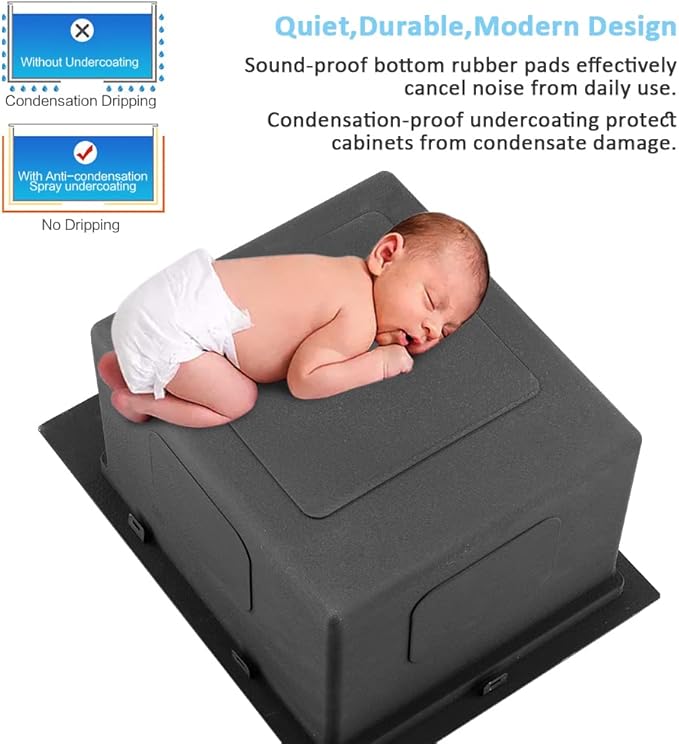 - Humanized Design: This bar sink is ultra quiet with thicker & softer Rubber Pads. 5 Efficient decontamination layers , X-shape flow line for better drainage. 10 Inch extra deep double bowl allows you to soak and clean large cookware and bakeware. Easy to clean corners make for a modern aesthetic and easier cleaning.