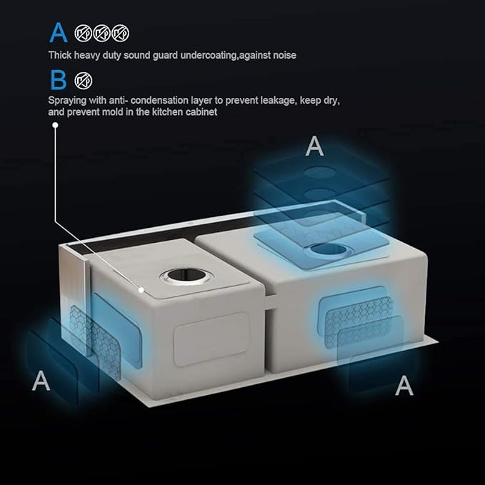 - Fast Drain and Sound Proof: Double bowl kitchen sink is designed with X-shaped diversion water and a gently sloped bottom to prevents standing water inside the bowl, drain more fast. 3mm rubber pads and full coating on the back ensure better sound dampening ability, and well prevent condensation from damaging your closet