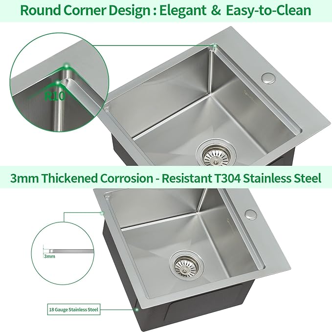- đĽ°ăT-304 Grade Stainless Steel Kitchen Sinkă: Made with T304 stainless steel(18% Chromium), it is durable. A brushed finish makes the sink rust-proof, high temperature-proof, scratch-resistant, and anti-stain.