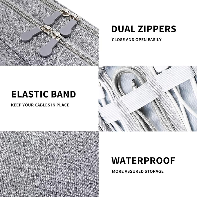 - Water-resistent: The cable organizer is made of water-proof polyester fabric, protecting your electronic accessories against from water damage. But please note the zipper part is not waterproof, so do aviod the hevay rain.