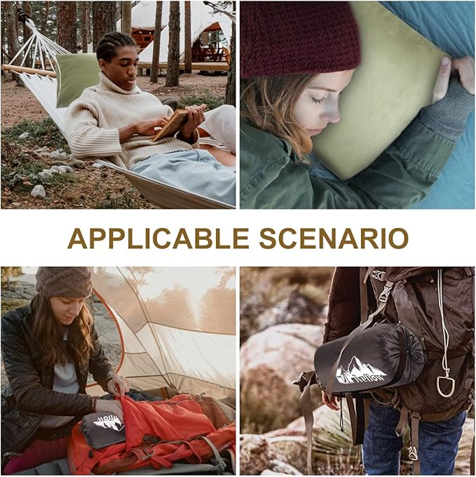 - 【Easy to Carry Travel Pillow】Our premium travel camping pillow is fully adaptable to all kinds of trips, like camping, fishing, backpacking, hiking, beach, festival, or other outdoor activities. Whether you're sleeping on a hammock, a plane, a beach, in a car, RV, or under a tent, hotel for a "Power Nap" in the office or on the couch, our travel pillow will give you a great night's sleep wherever you lay your head.