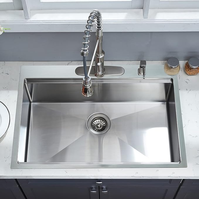 - 【16 GAUGE PREMIUM T-304 GRADE STAINLESS STEEL】Heavy-duty 16-gauge T-304 steel with thickened bowl for good scratch-resistance and dent resistance. High Grade Brushed Finish makes kitchen sink high temperature-proof, scratch-resistant, and will never rust or stain.