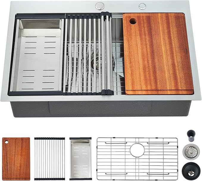 - 【HANDMADE WORKSTATION SINK WITH SINGLE-TIER TRACK】Integrated ledge as a track for sliding the built-in custom accessories, and it allows you to work directly over the sink with ease. Package includes Kitchen Sinks, heavy-duty Cutting Board, Stainless Steel Colander, Roll Up Dish Drying Rack, Bottom Rinse Grid, Sink Drain Strainer, Cutout Template, Mounting Hardware, and Installation Guide.