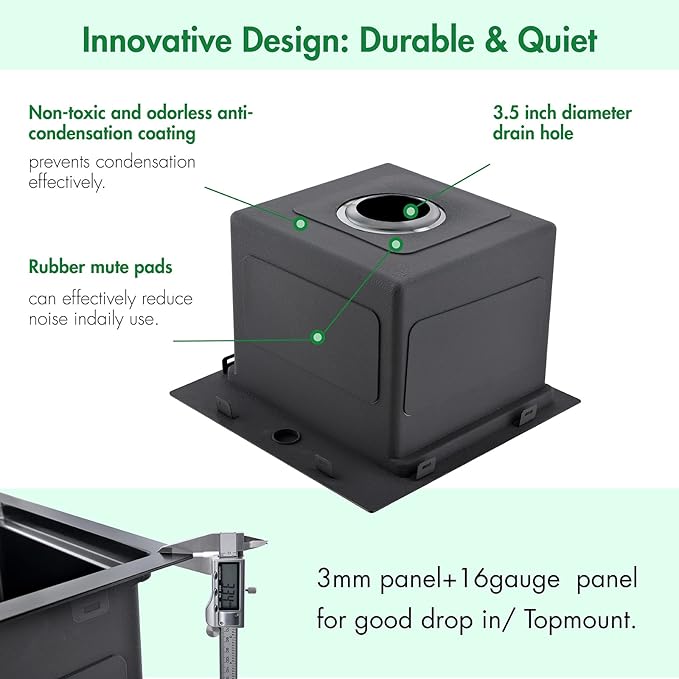- 【ANTI-CONDENSATION UNDERCOATING & ANTI-NOISE THICK RUBBER PADDING】The anti-condensation coating and thick rubber padding on the sink bottom effectively minimize condensation and noise.