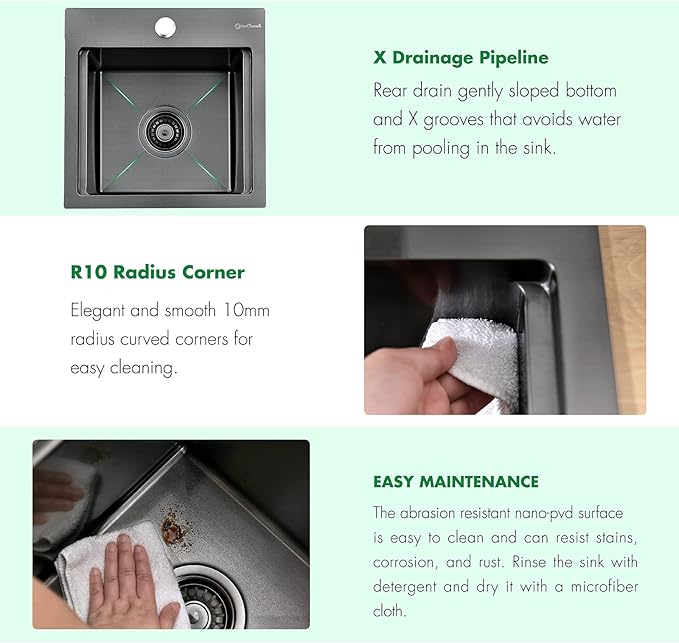 - 【EASY TO CLEAN & EFFICIENT WATER DRAINAGE】Rounded Corners of R10 mm radius and highly smooth surface finish allow you to wipe clean up the sink easily. Sloped sink bottom with innovative X-shaped DRAIN GROOVES helps drain water quickly and prevents water from pooling.