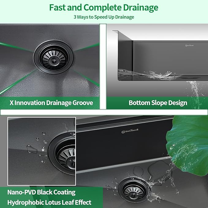 - 【GUNMETAL BLACK FINISH】GUNMETAL BLACK COLORED FINISH applies an outer vaporized Titanium alloy protective layer attached to the sink surface using innovative NANO PVD technology, which improves durability and corrosion resistance,scratch-resistance of the sink, and the sink will never rust or stain. There is additional transparent DRAINAGE COATING attached to the outermost surface of the sink, which greatly improves water drainage, and prevents water spots and fingerprints.