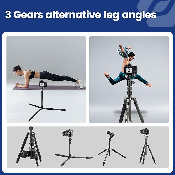 - Adjustable Heights and Angles: The tripod features 5-section legs, extending from 13.38 inches (34 cm) to 59.8 inches (152 cm), with three leg angle adjustments for versatile shooting positions. The reversible center column also supports low-angle photography, ideal for diverse terrains and creative shots.