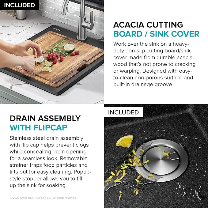 - OUTER SINK DIMS: 18” L x 22” W x 9 5/8” D – BOWL DIMS: 15” L x 16” W x 9” D – Min. Cabinet Size: 21” – KIT INCLUDES: drop in top mount workstation sink, heavy-duty acacia cutting board/sink cover, stainless steel drain assembly with strainer