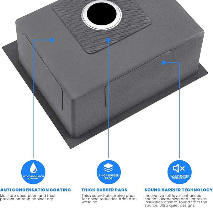 - 【Sound Technology】Kitchen Sink is equipped with 3mm thick rubber dampening pads, reducing noise and vibrations caused by running water or dishes. An added protective layer and an anti-condensation spray undercoating are applied to prevent moisture accumulation
