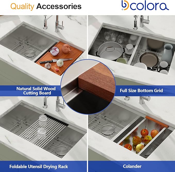 - Efficient Workstation: The built-in ledge turns the sink into a multifunctional operating space, and the matching chopping board, draining basket and other high-quality accessories provide you with a quiet, clean and comfortable environment. other high-quality accessories provide you with a comfortable kitchen experience.