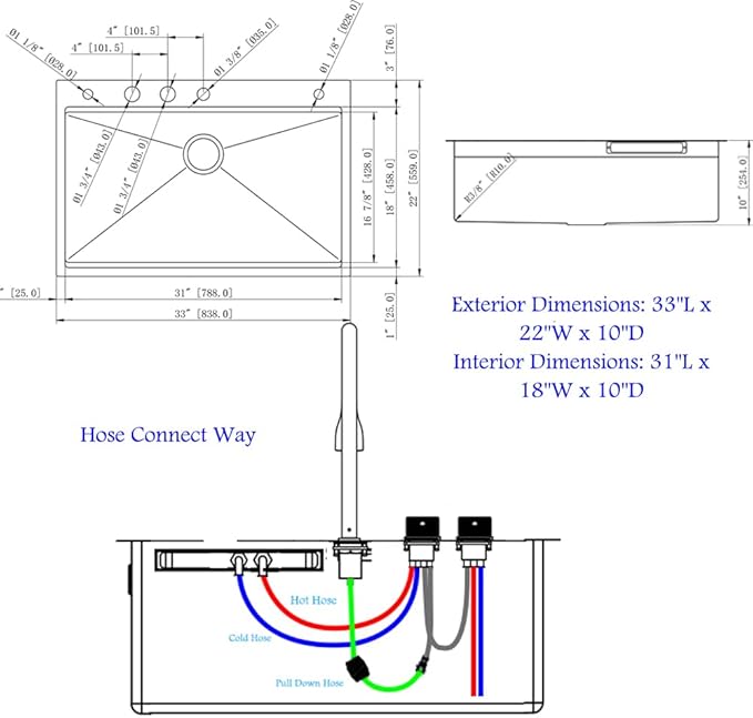 - Sink Dimension:Exterior Dimensions: 33"L x 22"W x 10"D, Interior Dimensions: 31"L x 18"W x 10"D. Standard 3-1/2" Drain Opening That Fits the Most Common Garbage . If you have any problem during installation, please feel free to contact us.