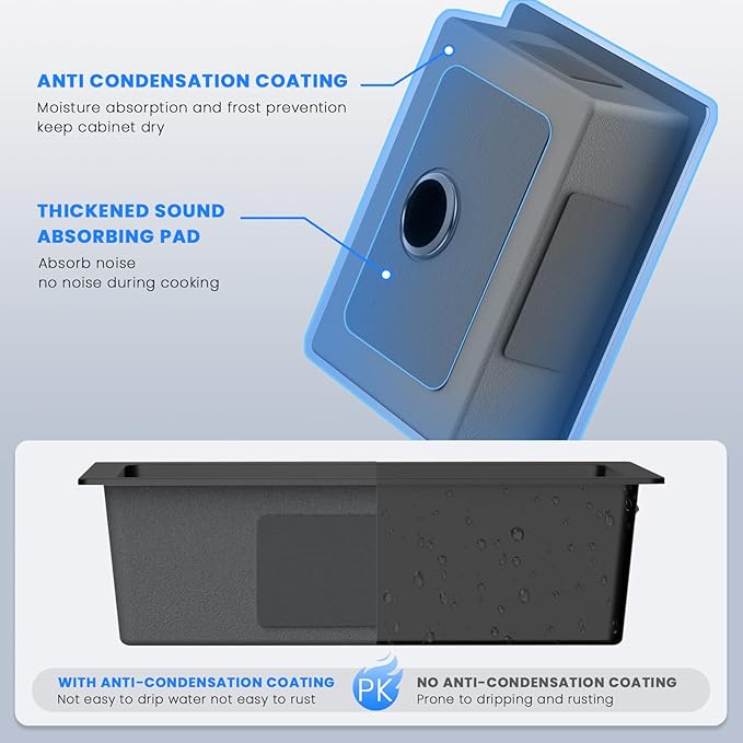 - 【Noise Cessation & Moisture Barrier】Use 3mm sound guard undercoating and thick rubber padding, covering more than 90% of the sink area,reducing the sound of running water and absorb sound from the source, Ultra quiet designs. Anti-condensation Coating, isolate condensate