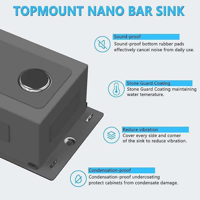 - [Anti-noise & Anti-condensation]: Designed with anti-condensation undercoating and anti-noise thick rubber padding on the sink bottom minimizes the sound of the drum and reduce the vibration. The protective layer can keeping the cabinet dry and clean.