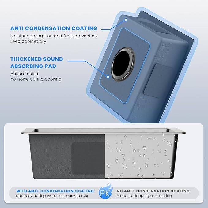 - 【Quiet & Protected Design】Equipped with 3mm thick sound-dampening pads to reduce noise and vibration from water and dishes. An additional protective undercoating helps to minimize moisture accumulation (condensation) under the sink