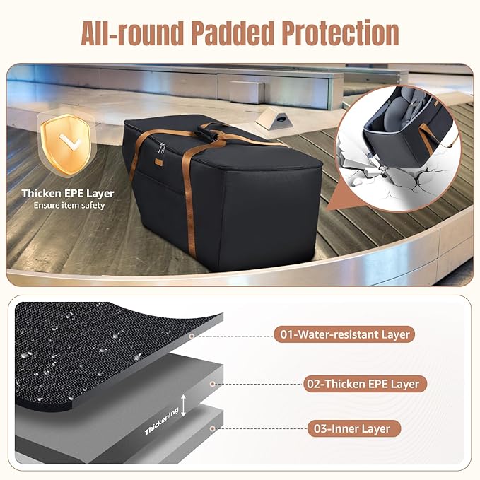 - [Multilayered Protection]Carseat travel cover is crafted from durable, water-resistant 900D polyester fiber with a multi-layer design. It features sturdy lockable double zippers, an adjustable fixing strap, thick protective padding, providing the ultimate protection for your child's car seat during travel