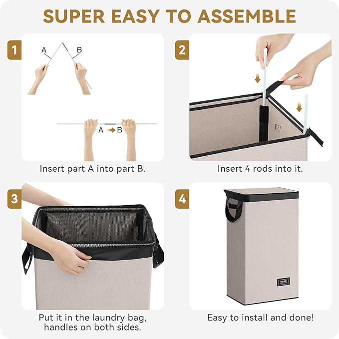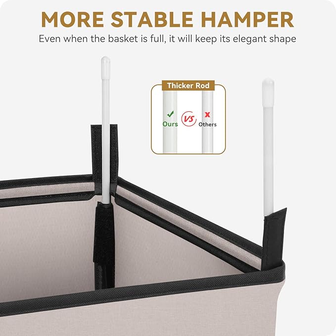 - 【Sturdy Structureand Not Deformed】 The 4 insert rods of the hamper is thicker and stronger, and the MDF panel is added at the bottom, a metal frame is embedded in the top to form a solid structure of the clothes basket. It will not collapse or deform after long-term use and remains rigid even when the hamper basket is filled.