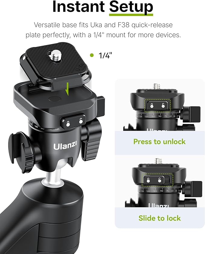 - 【ULANZI Fast Installation Ecosystem】The TT38 mini tripod enjoys rapid setup and disassembly with the one-second release design, desk tripod is compatible with UKA and F38 quick-release plates for effortless camera attachment and removal.