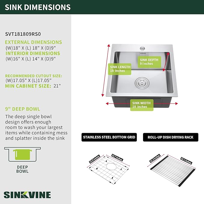 - KIT INCLUDES: Kitchen bar sink, roll-up dish drying rack, bottom rise grid protector, drain assembly w/ removable strainer - Installation-ready sink comes with cut-out template for drop-in installation - Backed by SINKVINE LIFETIME LIMITED WARRANTY