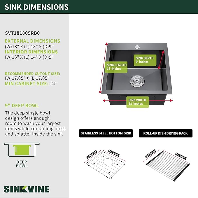 - COMPACT SIZE: Exterior Dimensions: 18" (W) x 18" (D) x 9" (H) | Interior Dimensions: 16" x 14" x 8.66" | Minimum Base Cabinet: 21" wide | Standard 3.5" drain opening fits any garbage disposal unit. The sinkโs ample single-basin design ensures easy cleaning of large cookware, making it perfect for wet bar areas, compact RV kitchens, outdoor BBQs, and poolside entertainment