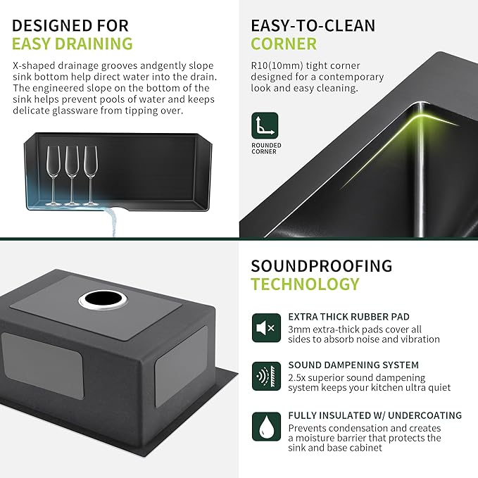 - FAST DRAINAGE - The Rear-offset drain offers more work surface inside the sink. design for X-shaped drainage grooves for fast drain and dry; included a rise grid levels sink base so nothing tips over - ULTRA QUIET: 3mm heavy-duty rubber padding keeps your kitchen clear of excess noise from running water and disposal vibration