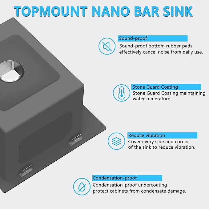- [Anti-noise & Anti-condensation]: Designed with anti-condensation undercoating and anti-noise thick rubber padding on the sink bottom minimizes the sound of the drum and reduce the vibration. The protective layer can keeping the cabinet dry and clean.