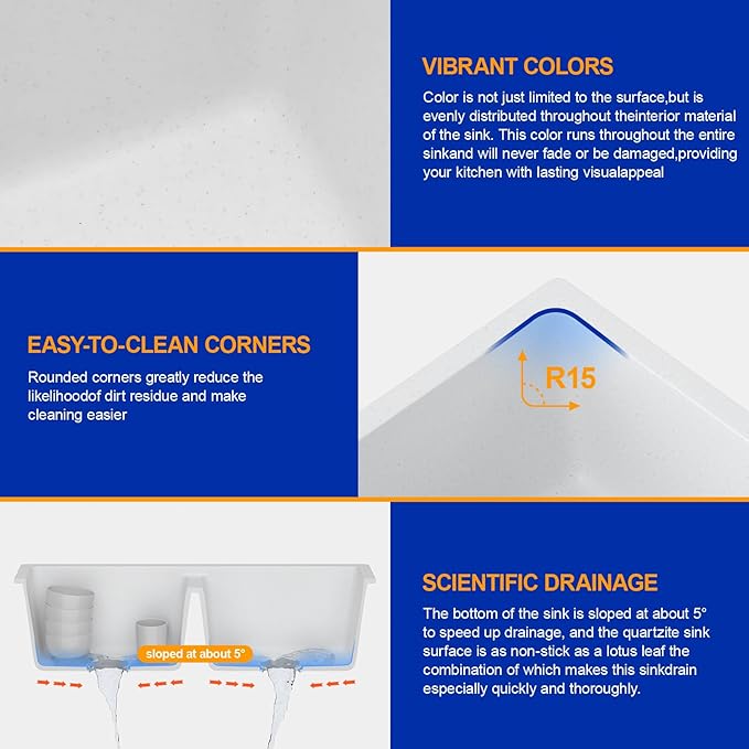 - Easy to Drain: Different from the traditional flat-bottom sink design, the bottom of this quartz sink adopts a gentle slope design to decrease water accumulation at the bottom of the sink, and drain faster and more thoroughly