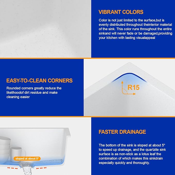 - High Quality Granite: Made of 80% natural granite and resin, the bright colors penetrate deeply into the quartz composite sink to maintain a beautiful appearance and are not easy to fade