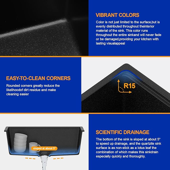 - Easy to Install: under-counter installation design fits the countertop, is easy to clean, does not easily hide kitchen waste debris, is beautiful and practical, and its consistent color is suitable for kitchens with various decoration styles