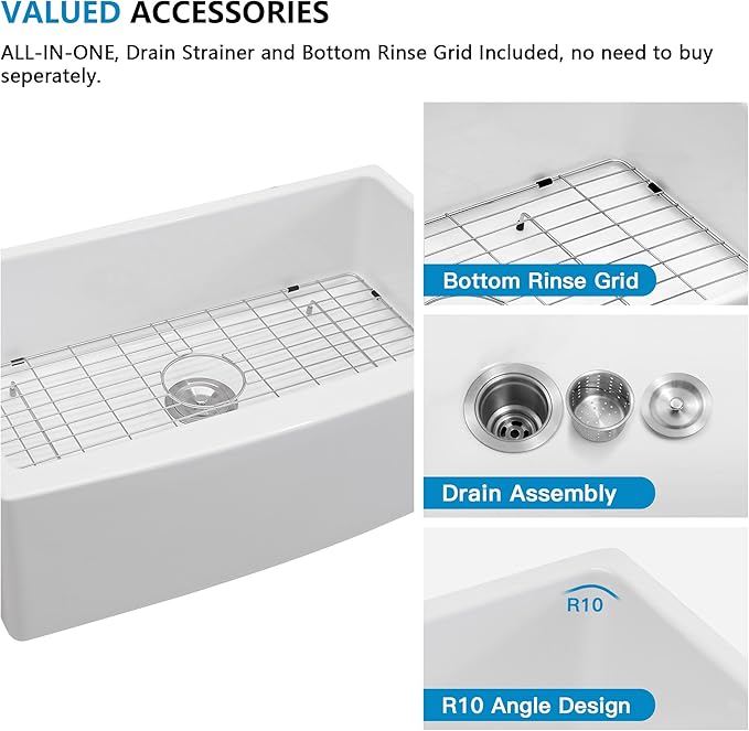 - The white farm sink offers a sleek, modern Curved design that seamlessly complements any kitchen style, enhancing your kitchen's aesthetic, please order with confidence, We provide a 3 months effortless exchanges and returns policy, if any quality issues about the 33 farm sink, pls reach out to us, Our customer care team is always ready to help you.
