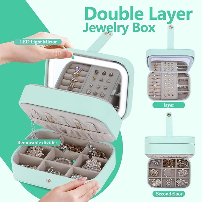 Travel Jewelry Case with LED Lighted Mirror, Personalized Birthday Gifts for Women Girls Kids, 2-Layer Portable Travel Jewelry Organizer, Travel Essentials (Cyan Blue)