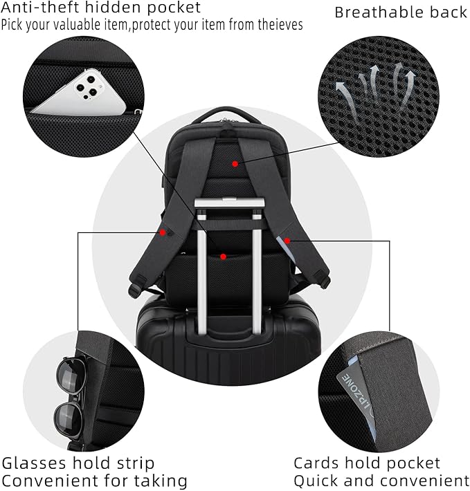 - FUNCTIONAL&SAFE: A luggage strap allows backpack fit on luggage/suitcase, slide over the luggage upright handle tube for easier carrying. With a hidden anti theft pocket on the back protect your valuable items from thieves. Well made for international airplane travel and day trip as a travel gift for men .