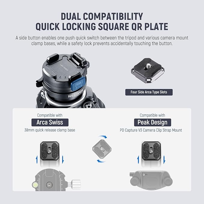 - 【Quick Lock Arca Type Square QR Plate】 The Arca type quick release plate is also compatible with the Peak Design PD Capture clip V3. A side button enables one push quick switch between the heavy duty video tripod and various camera mount clamp bases, while a safety lock prevents accidental contact with the button. Note: QR clamp compatible only with PD QR plates and included Arca type plates