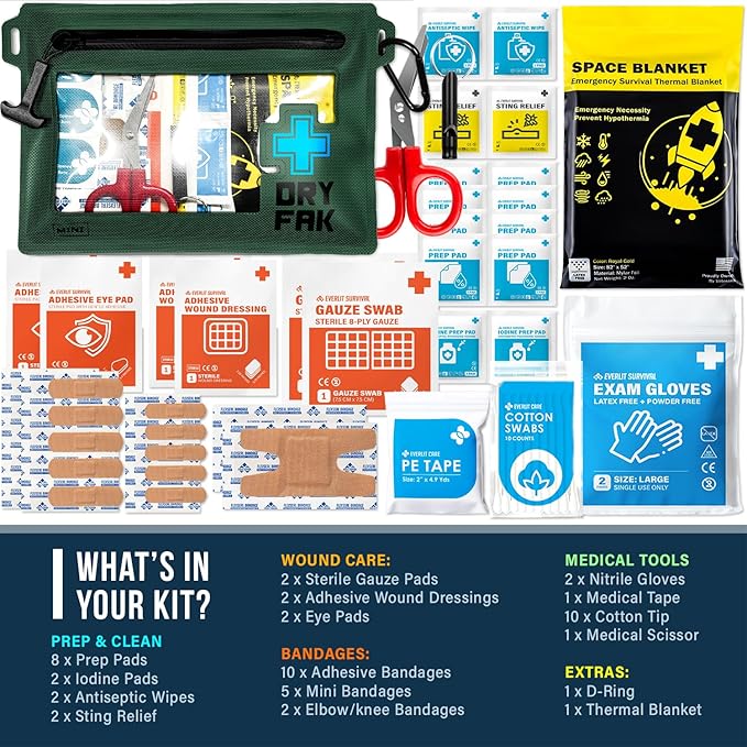 - Must-Have Essential for Every Outdoor Adventure: Whether you're hiking rugged trails, paddling downriver, this compact waterproof first aid kit is built to keep you prepared. Trusted by backpackers, it’s the perfect first aid kit for hiking, backpacking, kayaking, fishing, or biking. This personal first aid kit weighs next to nothing but delivers serious peace of mind. Ideal as a hiking medical kit, bike first aid kit, backpack first aid kit, or even a boat emergency kit.