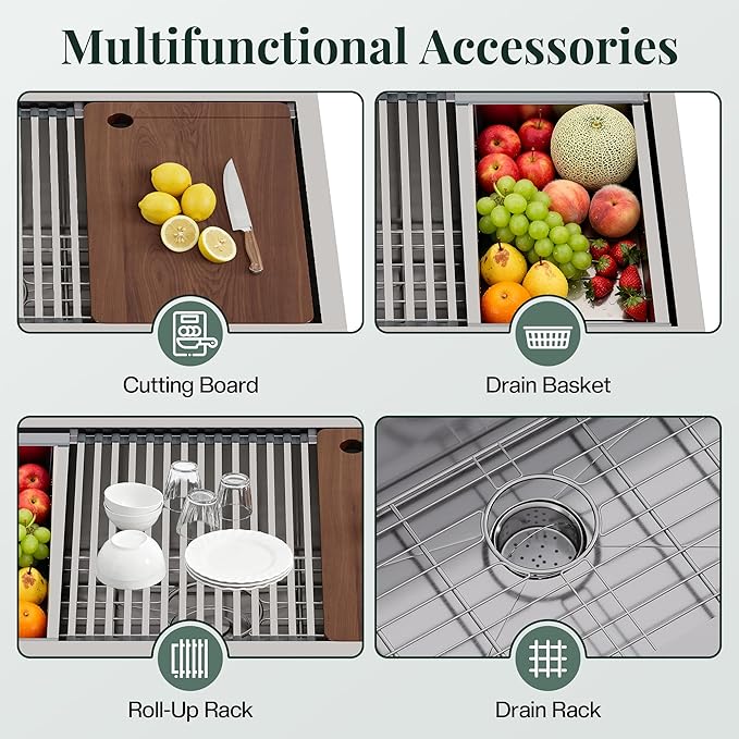 - Full Set of Accessories: Includes drying rack, roll-up rack, stainless basket, and cutting board. A fully equipped stainless steel kitchen sink workstation for washing, prepping, and organizing