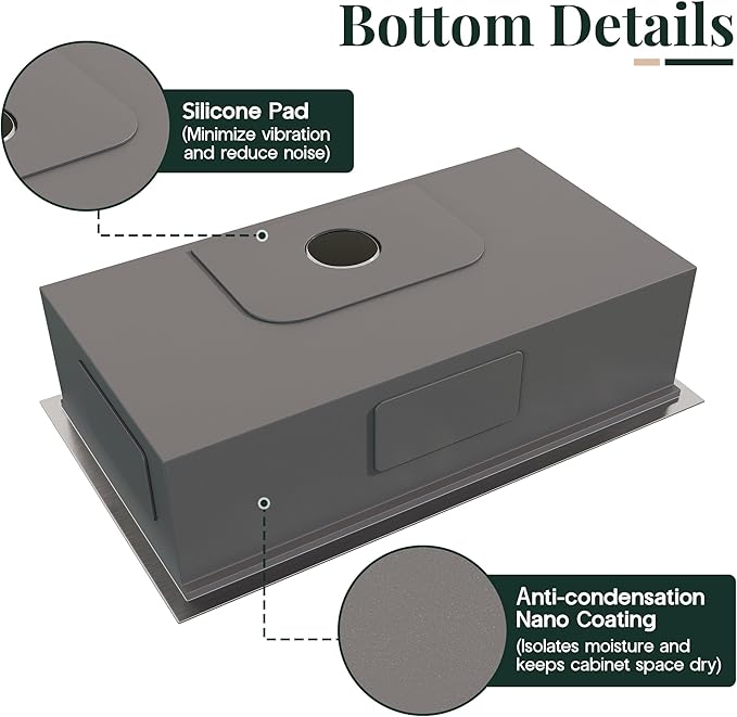 - Durable Stainless Steel: Made of brushed stainless steel with anti-condensation coating. This stainless steel sink is rust-proof, dent-resistant, and built for long-term use