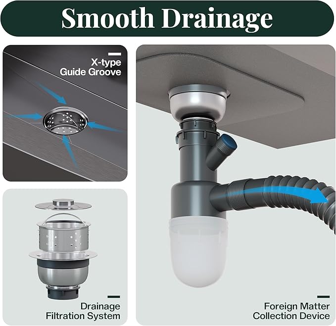 - Efficient Drainage System: X-grooves and filter basket ensure fast draining. This sink features a built-in strainer to prevent clogs and allow easy removal of debris