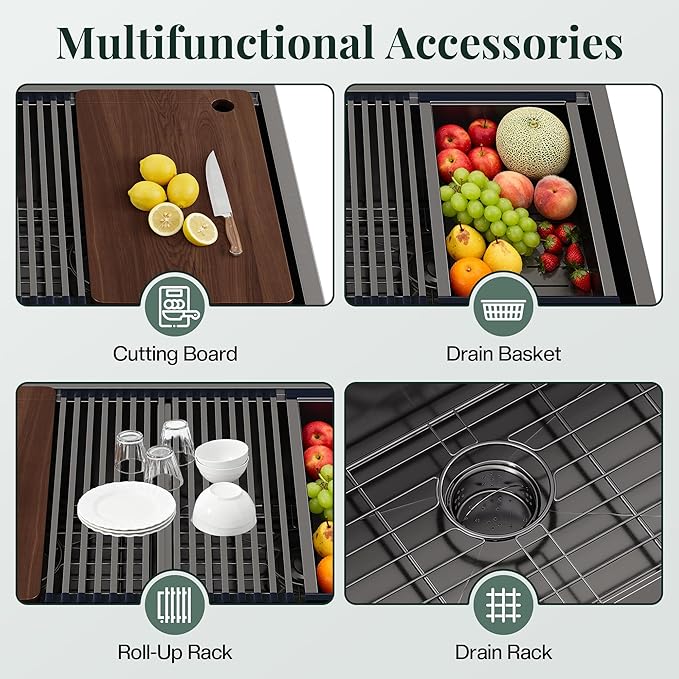 - Full Set of Accessories: Includes drying rack, roll-up rack, stainless basket, and cutting board. A fully equipped stainless steel kitchen sink workstation for washing, prepping, and organizing